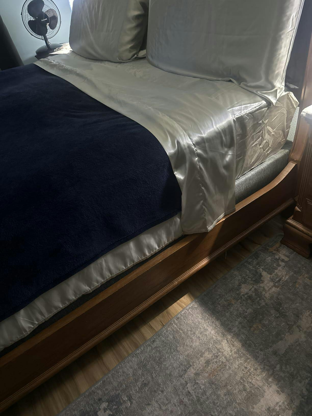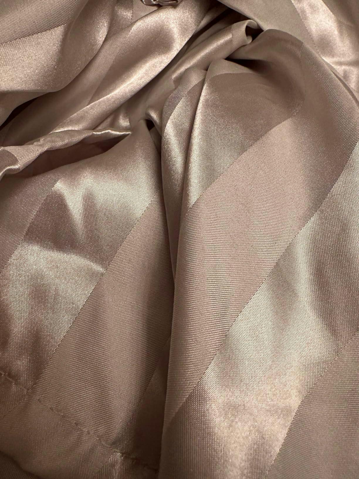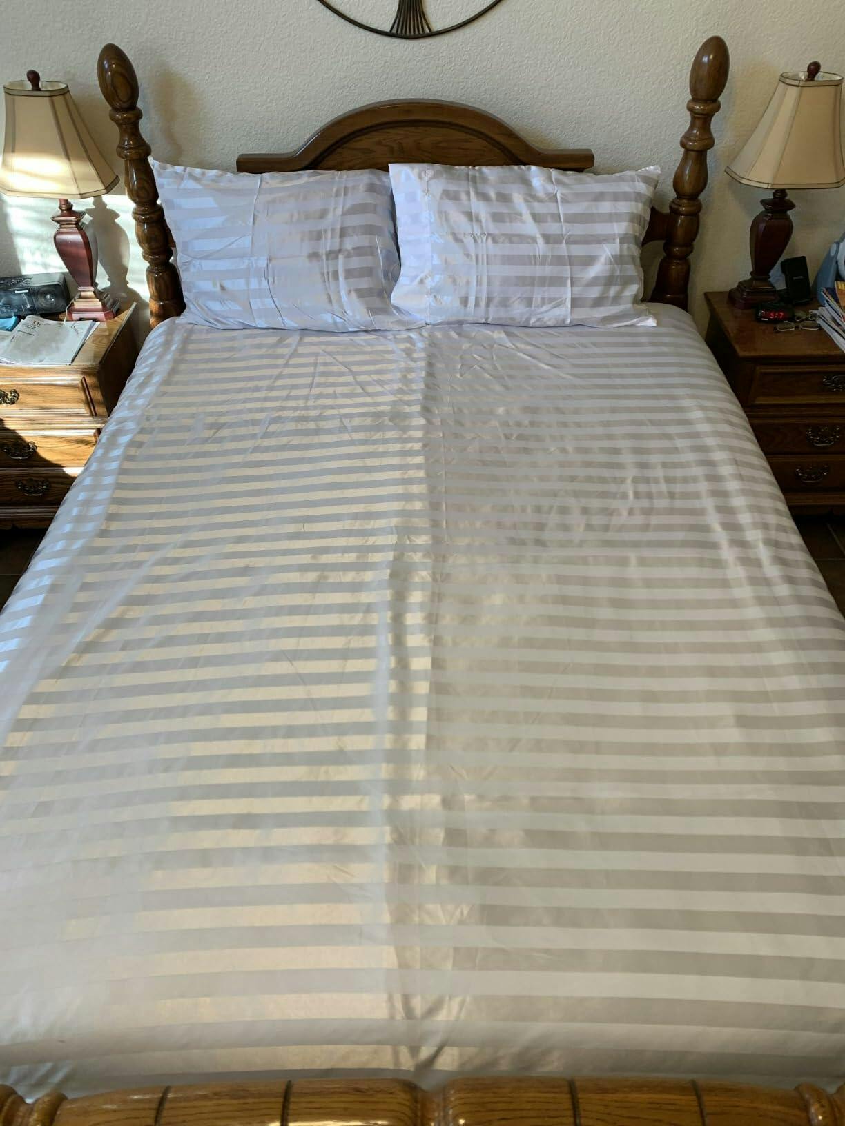 This striped satin sheet set is so smooth and comfortable! There has been zero pilling when washed and remains feeling silky. They fit perfectly on my king sized bed and the fitted sheet doesn't come off easily. This really feels luxurious without breaking the bank. I love using satin sheets to protect both my skin and hair. These work perfectly for those needs while also keeping me nice and cool while I sleep.