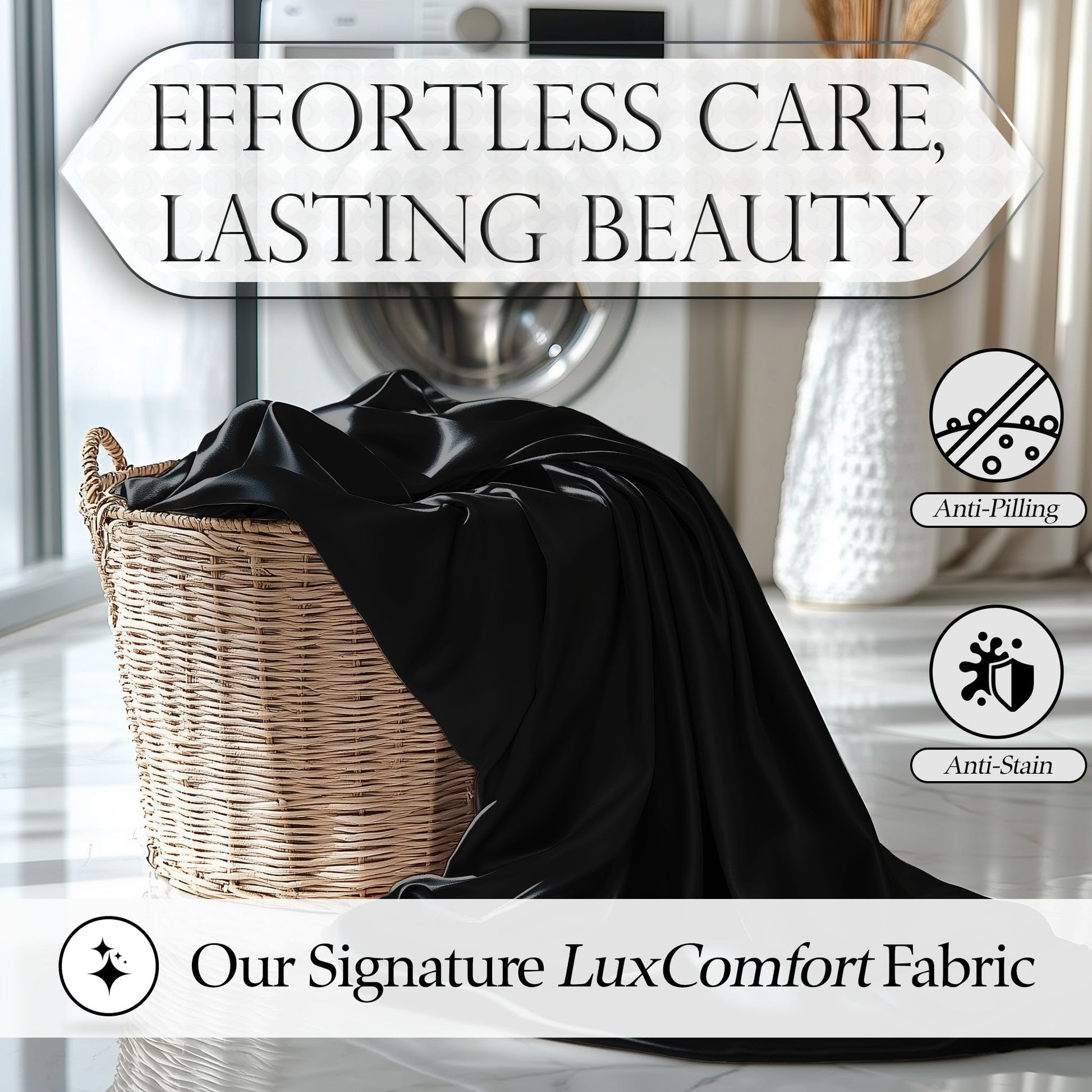 Made with 100% polyester satin for that silk-like sheen. To preserve the beauty of your black satin sheet, machine wash cold on a gentle cycle with mild detergent. Tumble dry on low or hang dry. Avoid bleach and high heat to maintain softness and luster.
