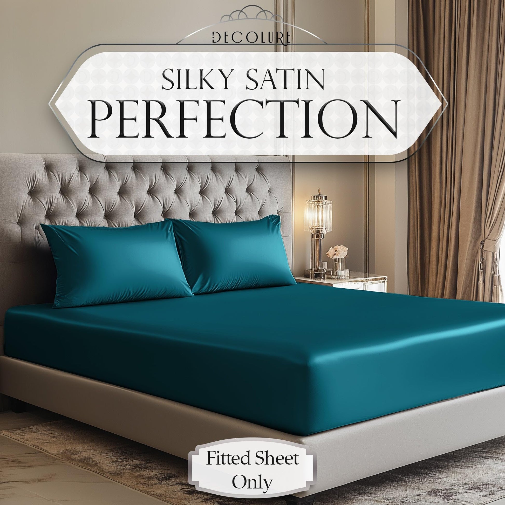 Vibrant and refreshing, sea teal satin fitted sheet adds a splash of color to your sleep space. The silky-smooth texture and breathable fabric offer cooling comfort, while deep pockets keep the sheet securely in place.