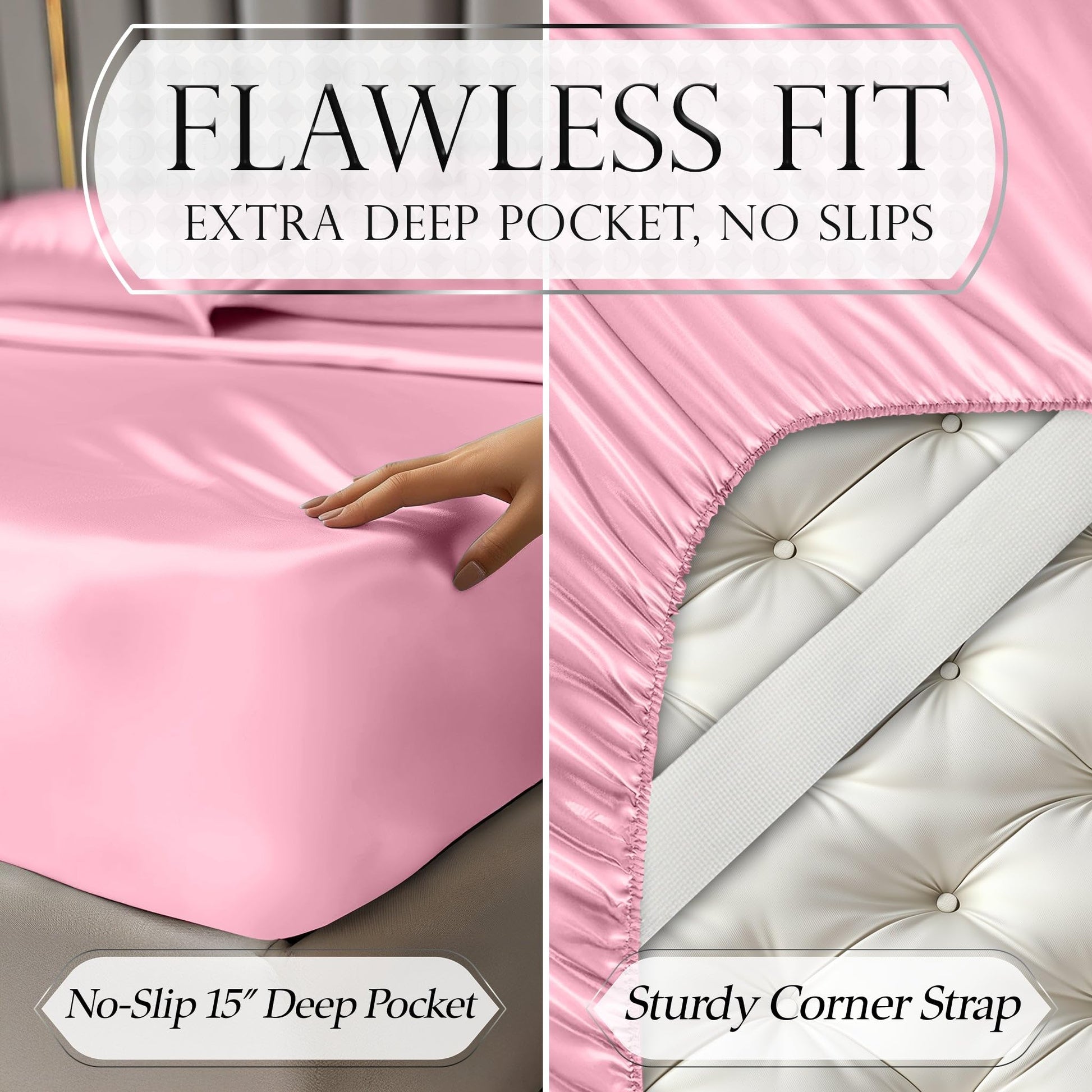 Designed for mattresses up to 15 inches deep, these pink satin bed sheets are available in Twin, Full, Queen, and King sizes.