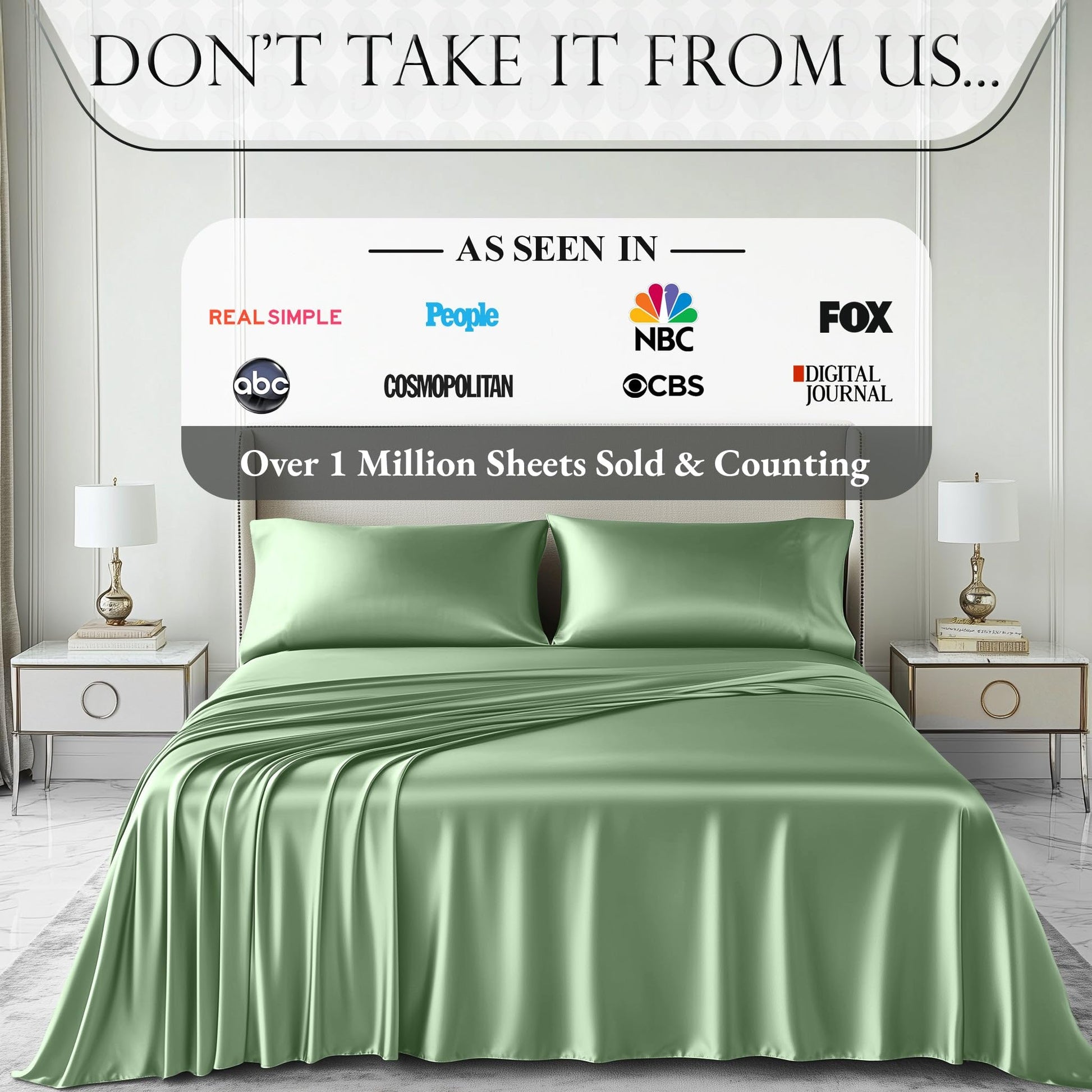 Sage green satin bed sheets are available in Twin, Full, Queen, and King. The fitted sheet features elastic all around to fit mattresses up to 15 inches deep.