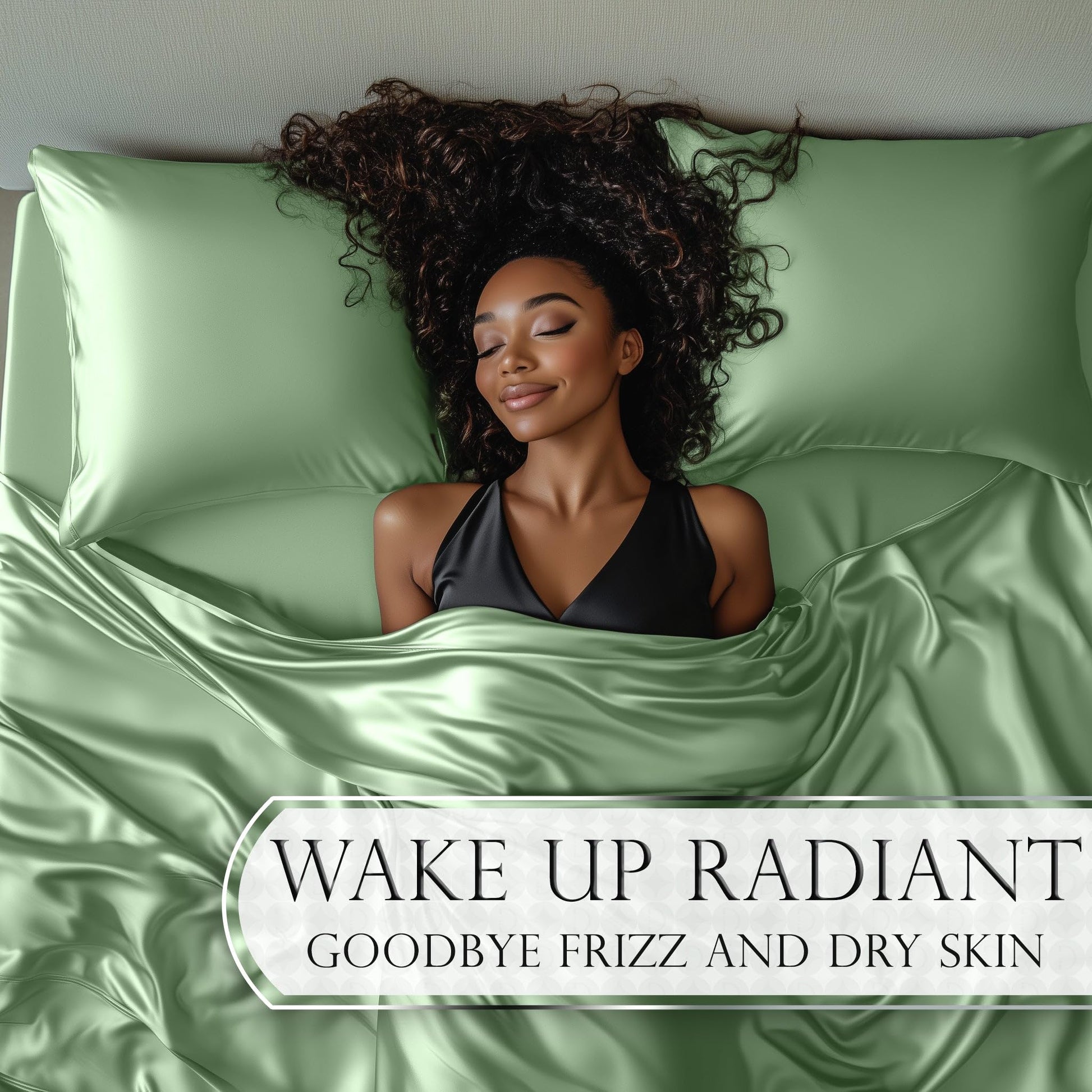 Breathable, hypoallergenic, and silky-soft, these sage green satin sheets are machine washable in cold water. Tumble dry low to keep them smooth and glossy.