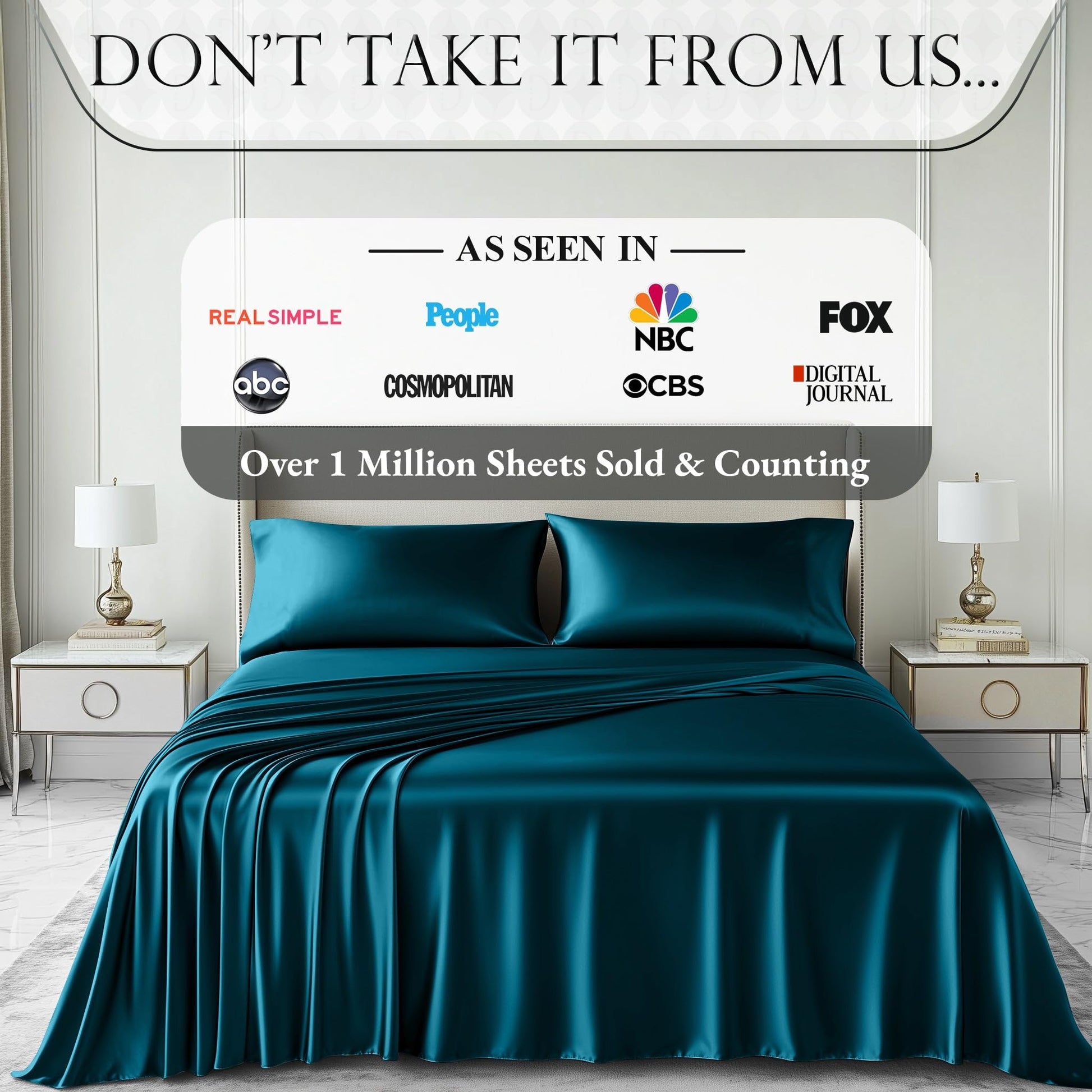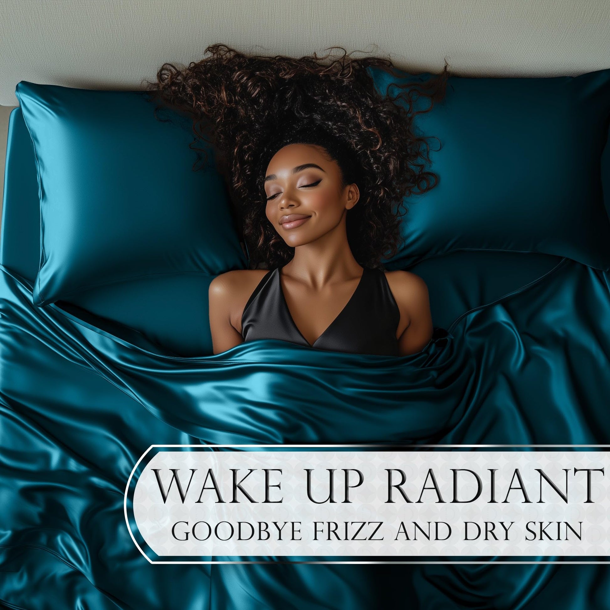These sea teal satin bed sheets offer deep-pocket fitted sheets for a snug fit and a glossy satin weave that feels soft against the skin. Cool and breathable, they’re among the best satin sheets for comfort and durability. This satin sheet set reduces hair frizz and prevents sleep lines while delivering vibrant style. Available in satin sheets queen and satin sheets king, they bring modern elegance to any room.