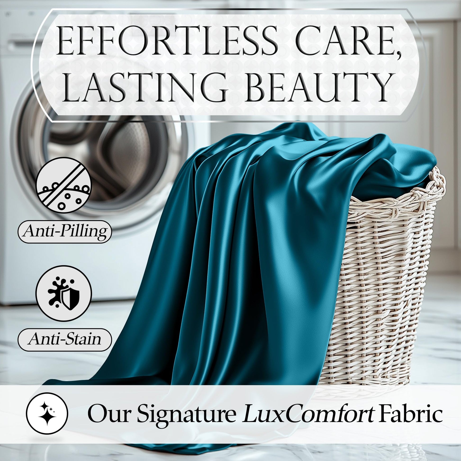 Crafted from soft, breathable satin weave, these sea teal satin sheets are hypoallergenic and lightweight. Wash in cold water on gentle and tumble dry low.