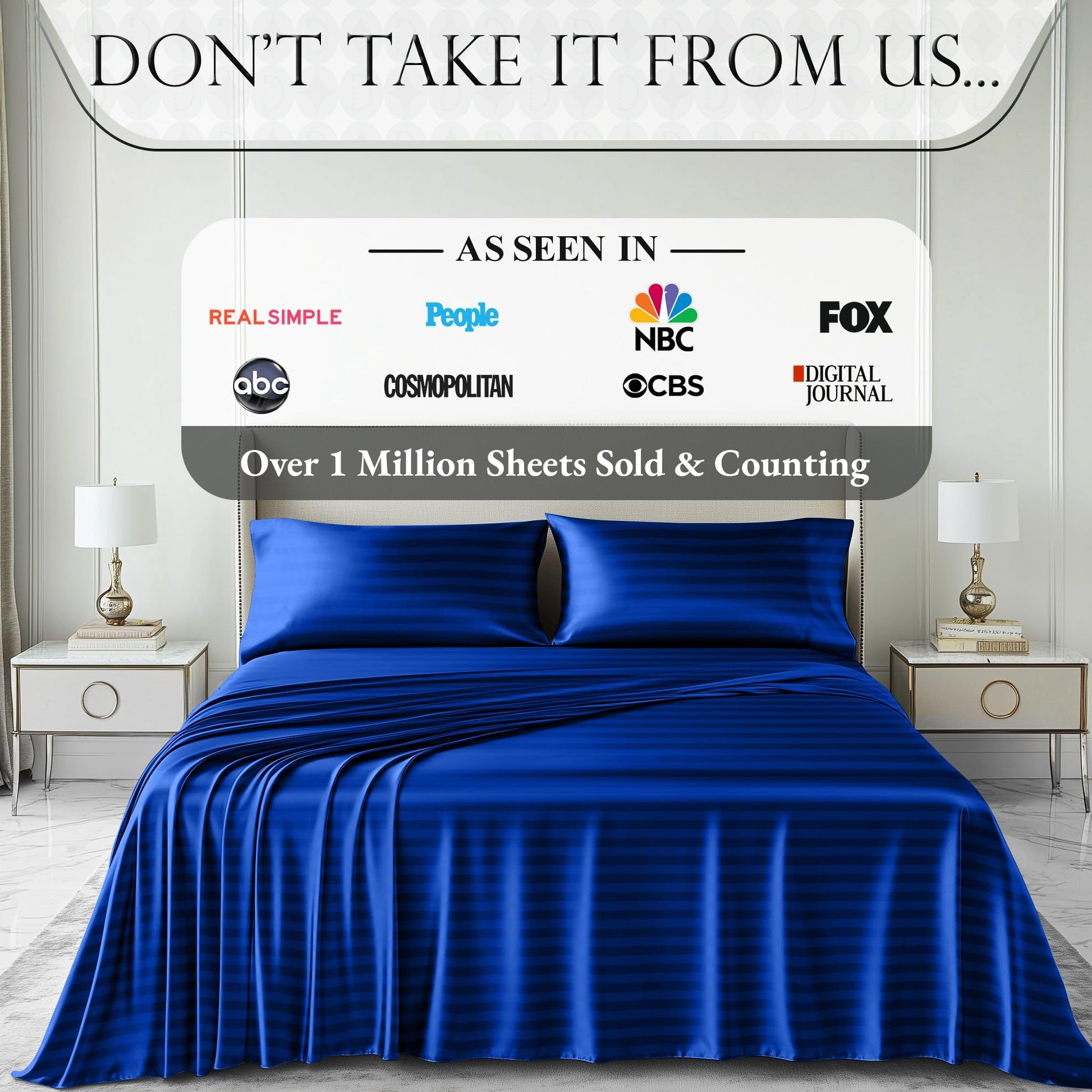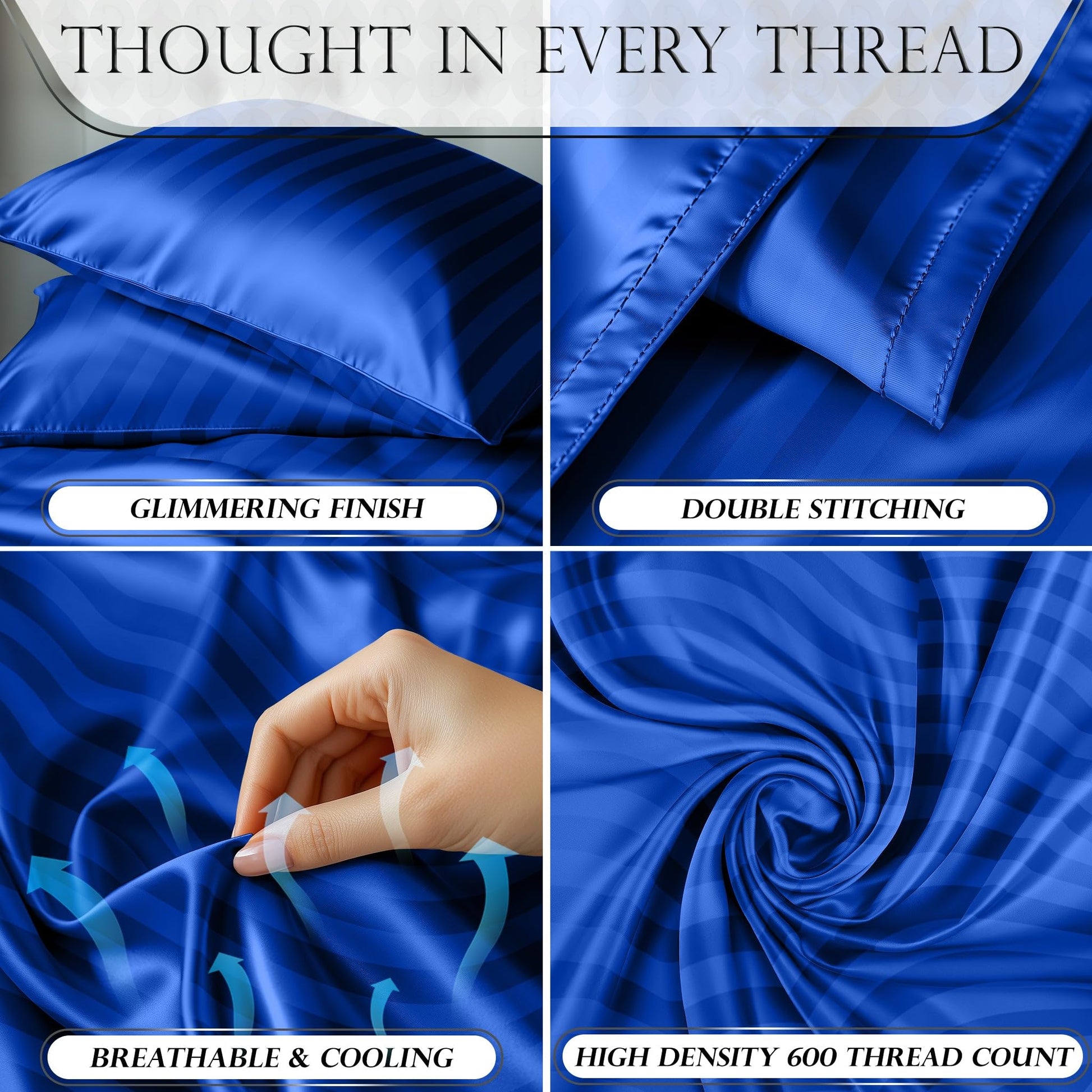 dd subtle sophistication with striped blue satin sheets featuring a heavenly soft & silky texture. Their breathable fabric keeps you cool, while the glossy satin finish gives your bed a refined sheen. Enjoy a durable, secure fit and a true touch of affordable luxury.