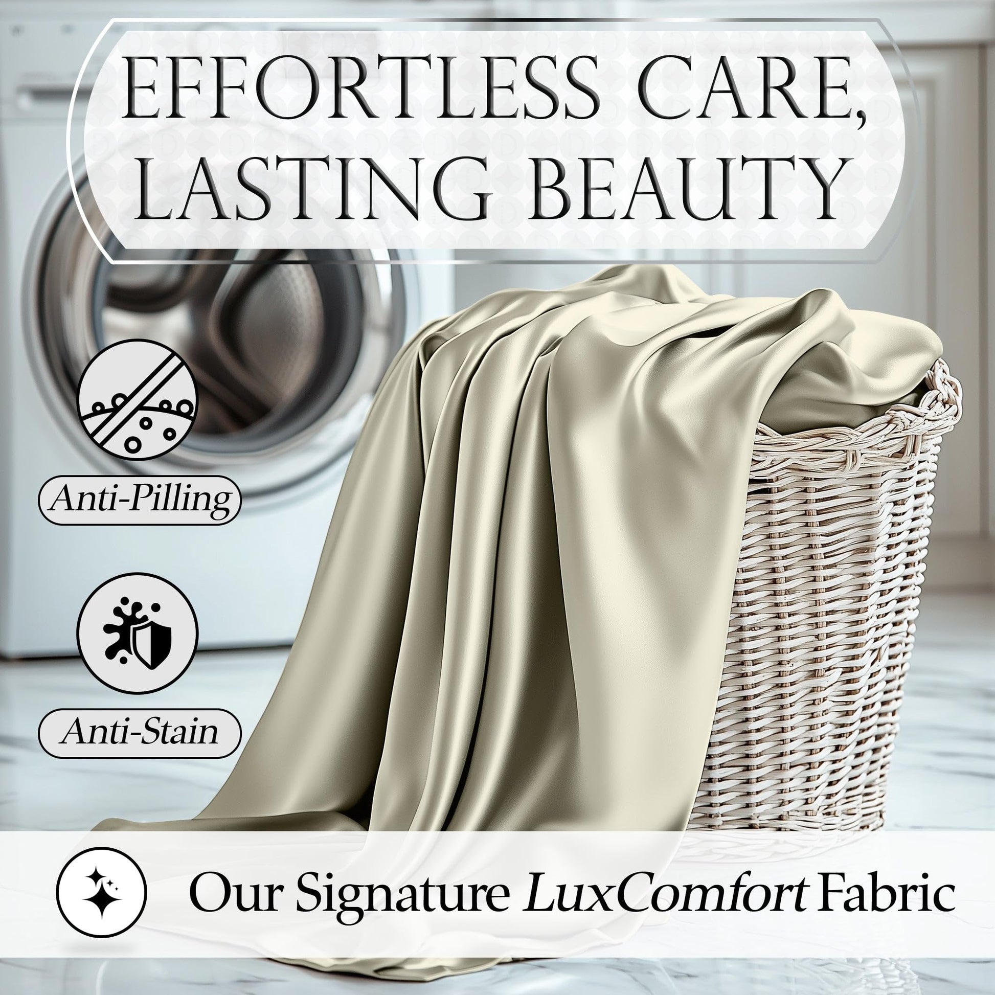 These taupe satin bed sheets feature deep-pocket fitted sheets for a secure fit and a smooth, breathable satin weave. Among the best satin sheets, they are soft, durable, and reduce friction on hair and skin. Perfect in satin sheets queen and satin sheets king sizes, this satin sheet set combines style, comfort, and lasting luxury.